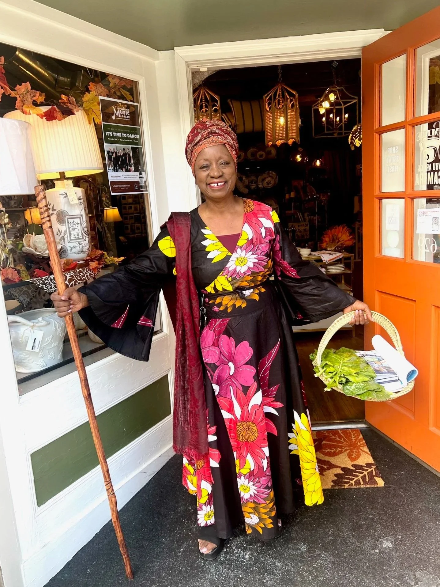 Left: Dell Omega Grant, Chair of the Georgetown Arts & Cultural Commission, dressed as walking art.